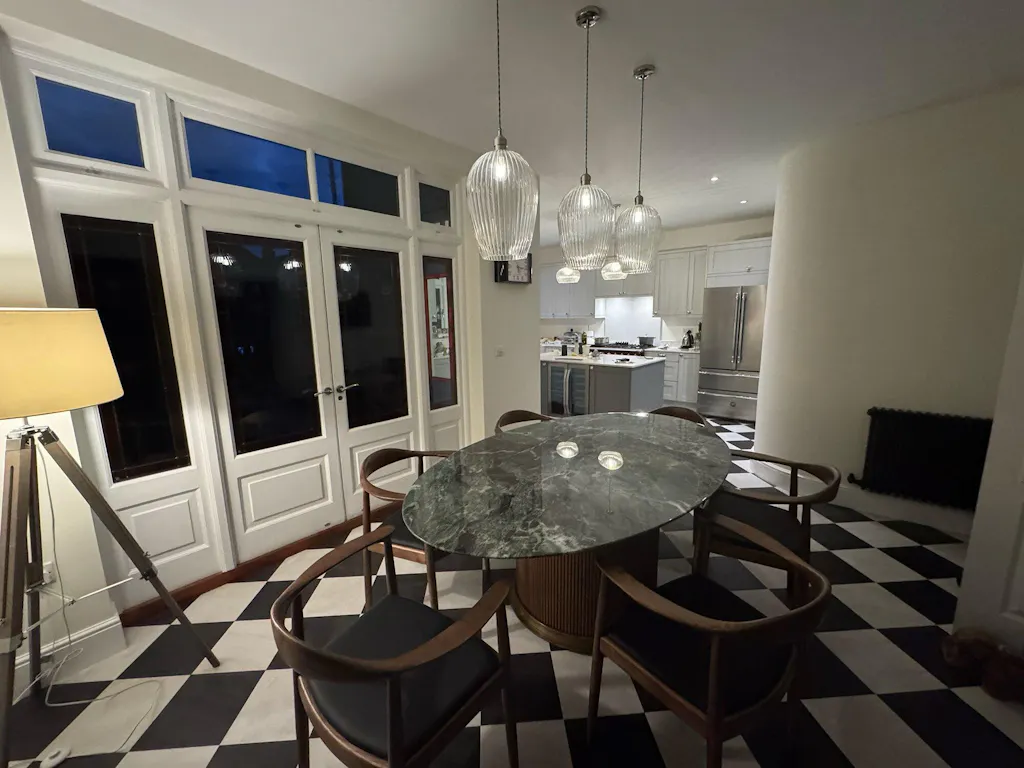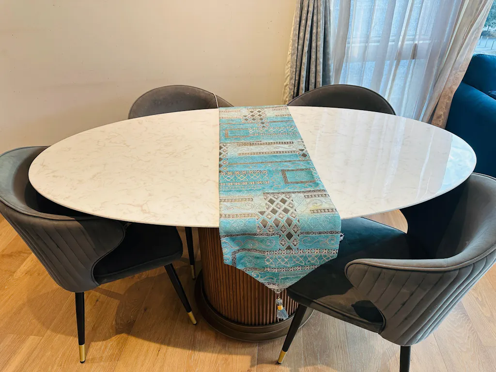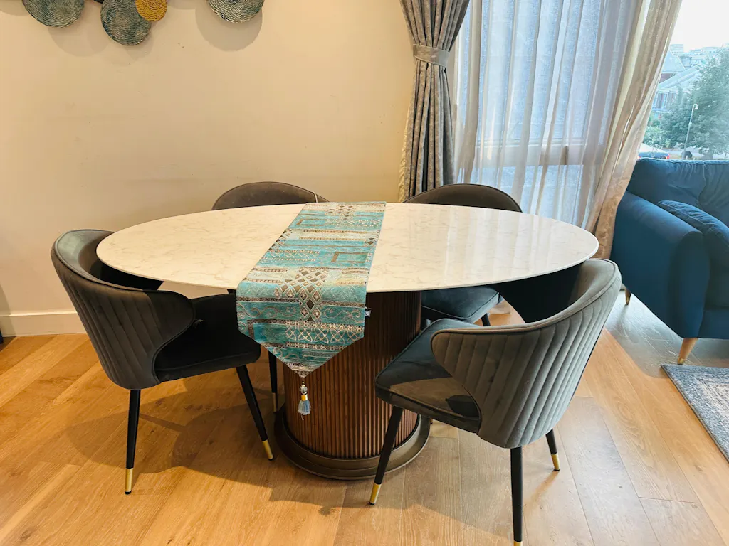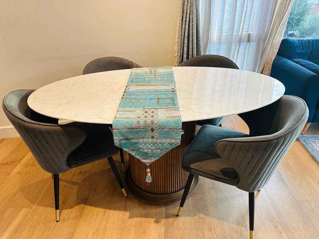• [Luxury Dining Table] Crafted with a sleek marble top and a sturdy ash wood or metal base, this table offers both sophistication and durability.